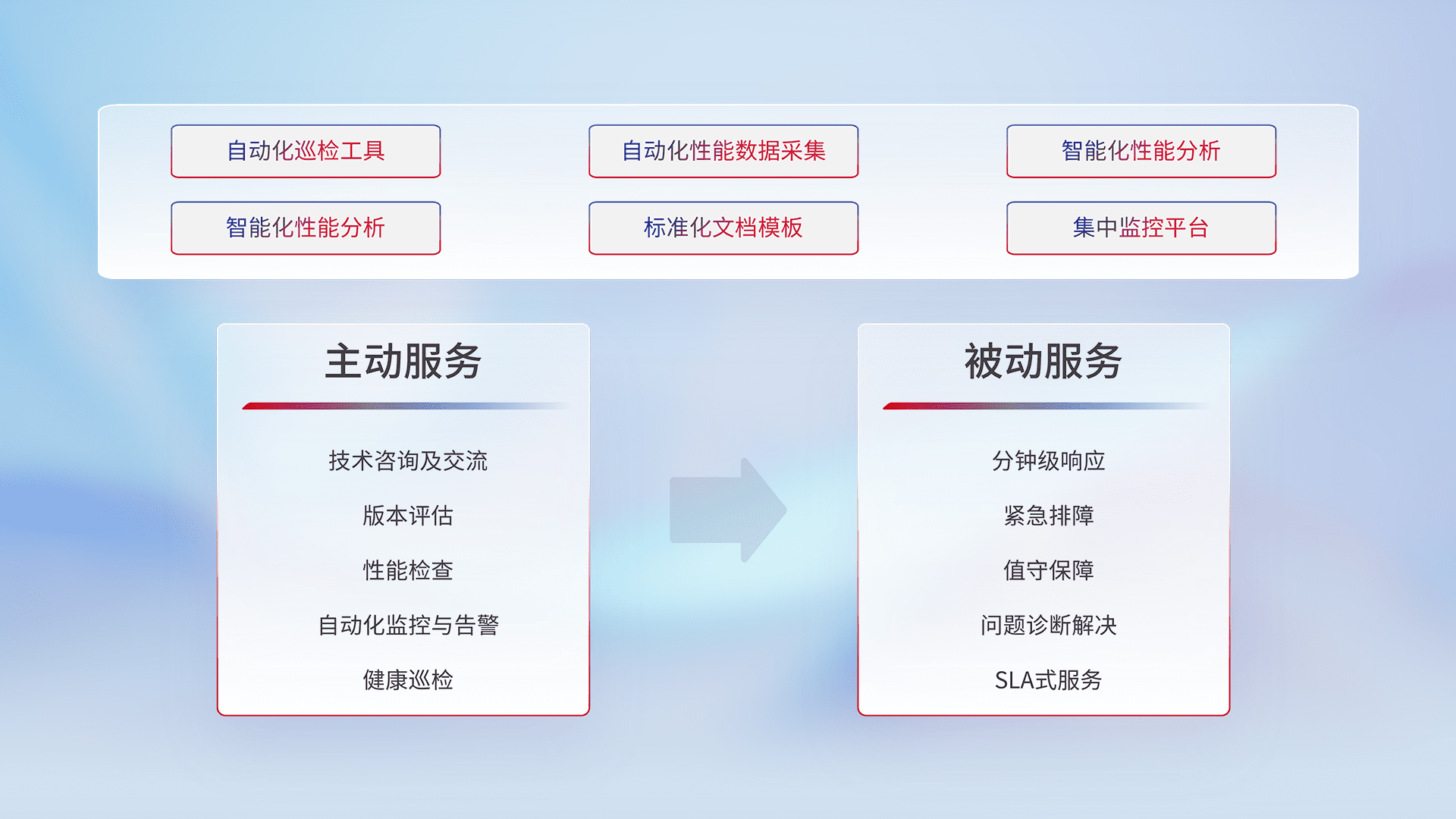 智能化工具和标准化文档,,保障服务质量,,,提供主动服务(包含技术咨询、、、版本评估、、性能检查、、、自动化监控与告警、、、健康巡检)和被动服务包含(分钟级响应、、紧急排障、、、值守保障、、问题诊断解决、、、、SLA服务)。。。